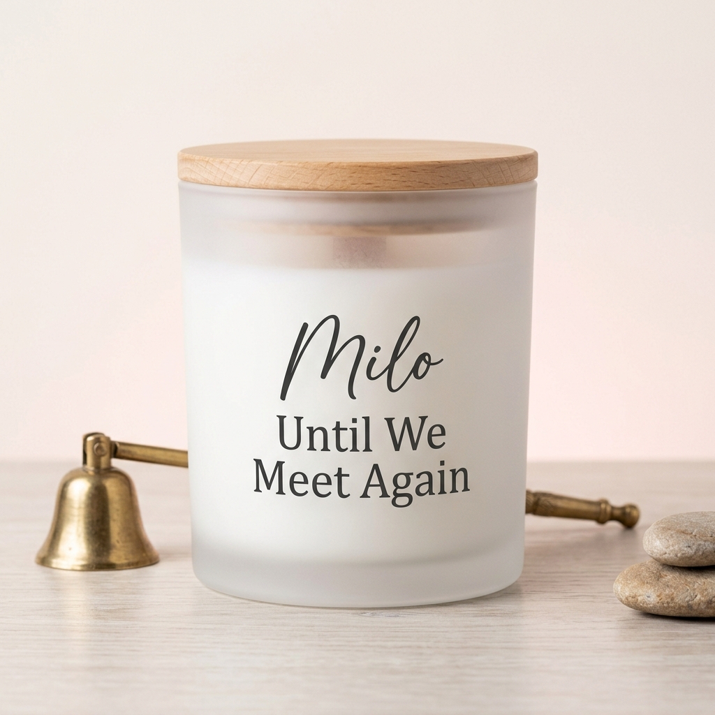 Premium memorial candles with permanent photo printing. Coconut wax. Wooden wick. Crafted in San Diego. For the grief that deserves more than flowers.